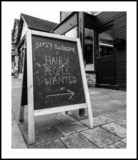 Day 39 – Hairy People Wanted… Posted on February 8, 2019 by nigelyoungblog Sign outside our local barbershop. One way to attract attention …! #27 Barbershop – iPhone XR Share this: Share on X (Opens in new window) X Share on Facebook (Opens in new window) Facebook Like Loading... Related