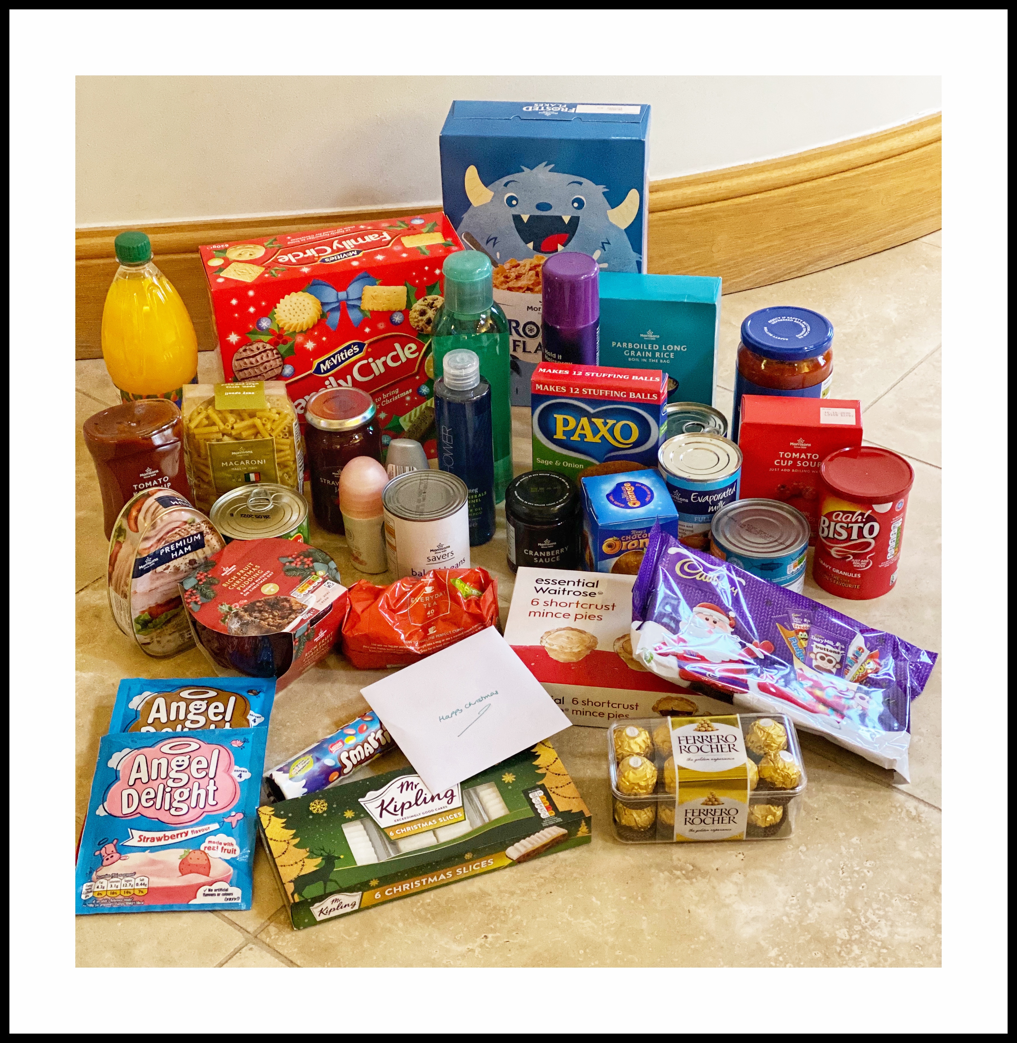 The dependence on food banks in the UK has seen a four fold increase in the last 5 years, and yesterday’s election win by the Conservatives will securely increase that. We made up two Christmas food parcels like this to help the less fortunate in our area – a mix of staple foods and some Christmas treats that will hopefully bring some cheer to disadvantaged families…