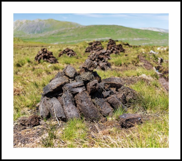 Peat, formed by the long term decay of vegetation in boggy wetlands, has been a fuel in Ireland for thousands of years. Although increasingly frowned on as ecologically unsound, it is still harvested by traditional methods, cutting it by hand, and leaving in small piles to dry out.