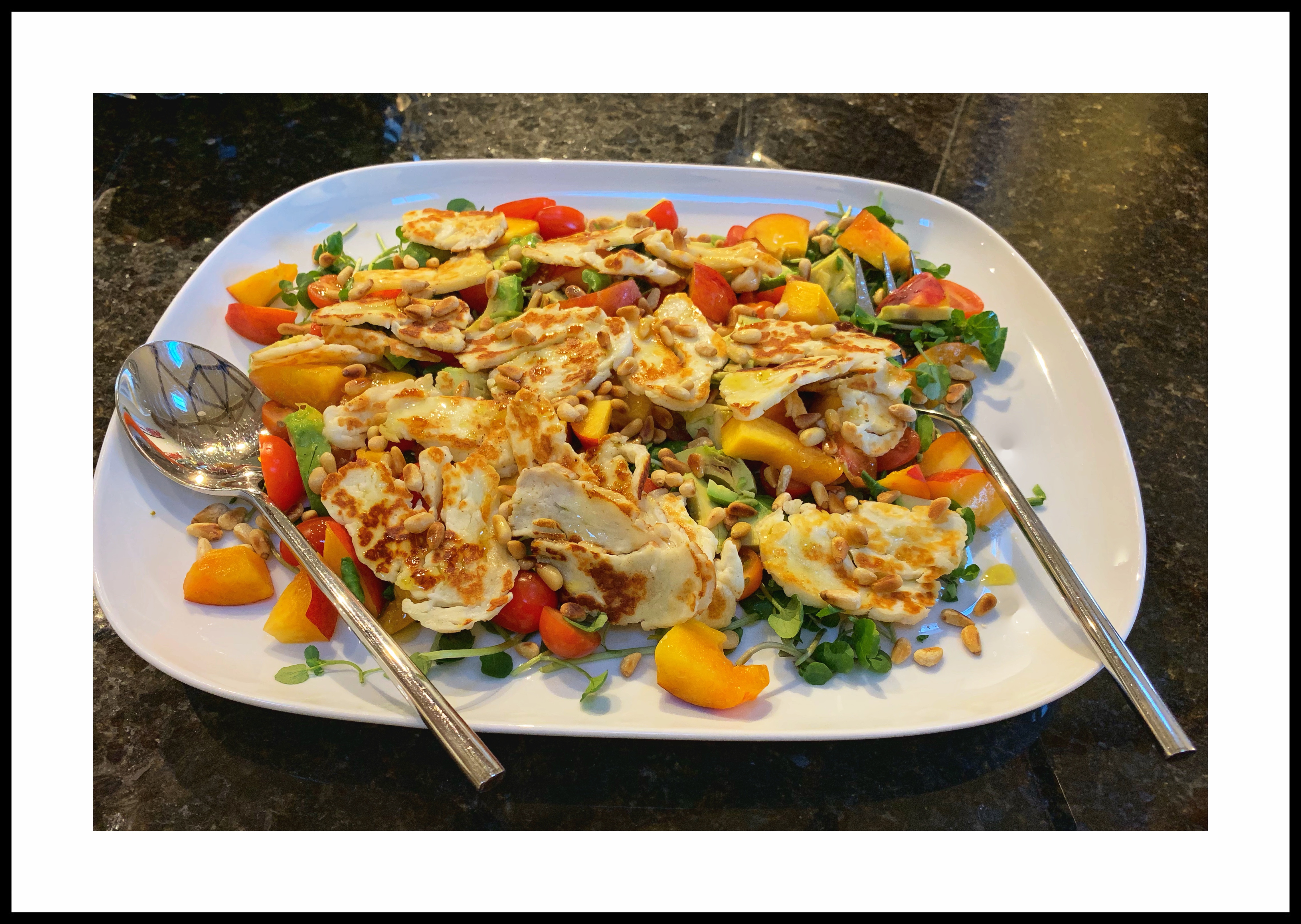 We both added a few extra pounds due to excellent food while we were on holiday, so it’s time to start eating healthily again… This tasted better than perhaps it looks in the photo – a halloumi cheese salad with nectarines, pine nuts and a sweet dressing.