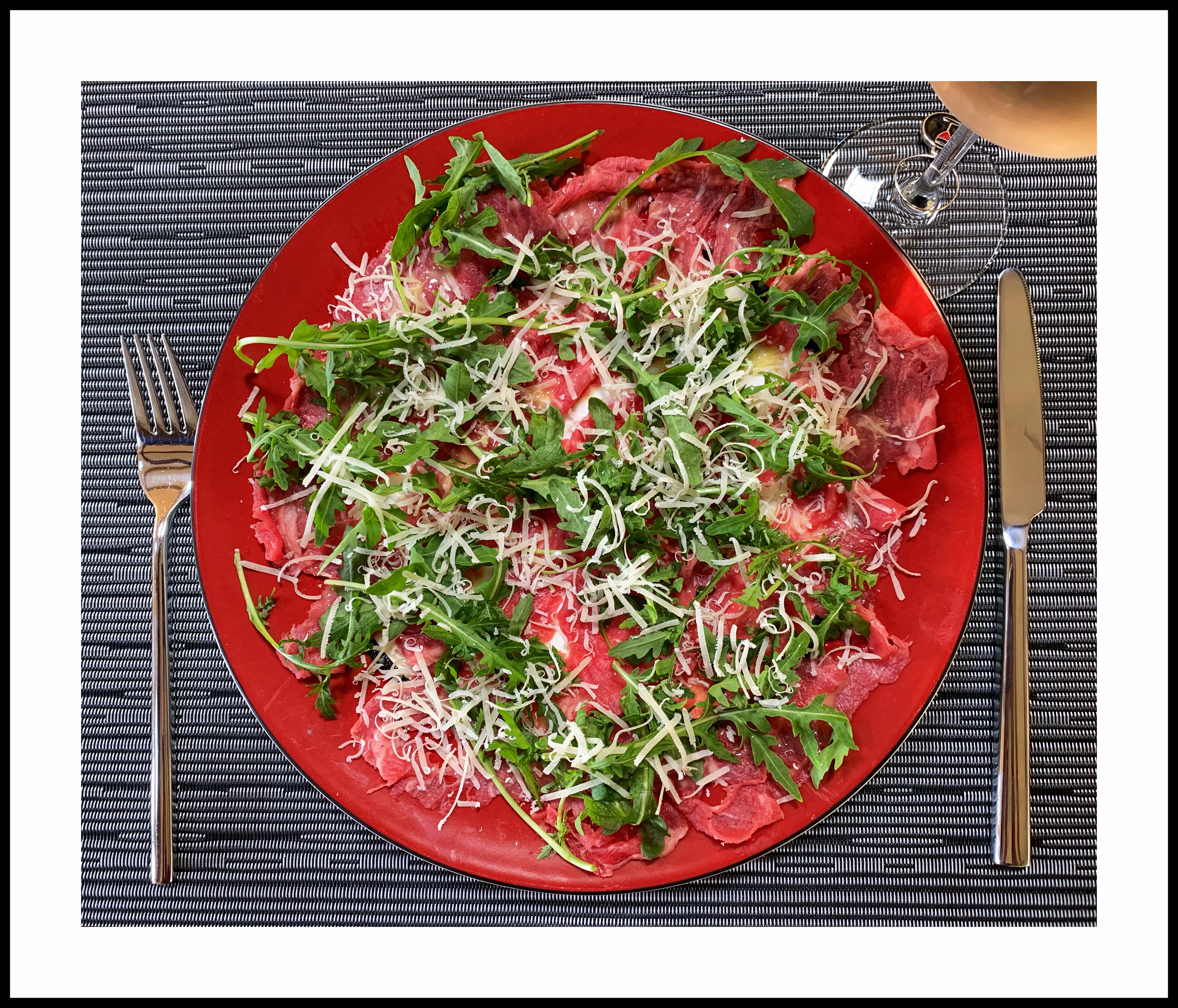 My favourite lunch – carpaccio of beef. We chill it for a couple of hours in the freezer, cut it thinly and then flatten it between sheets of cling film. Then serve with rocket leaves, parmesan cheese and a home made mustard dressing. Tasty!