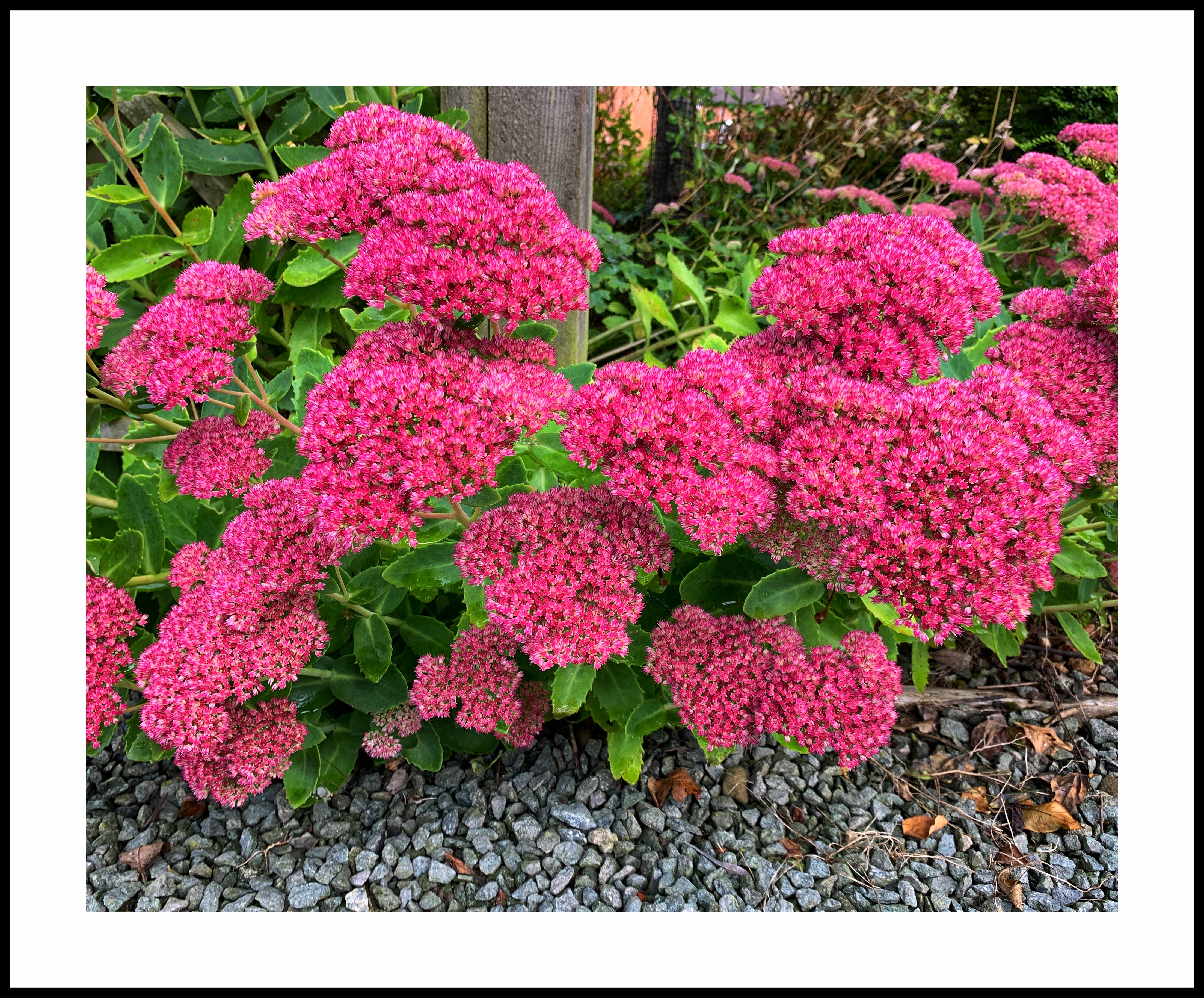 The cold wet weather that we came back to yesterday is certainly impacting on the garden – there are fallen leaves everywhere and most of the perennial plants have finished flowering and are looking very sad. The roses usually last until the first hard frosts, and this beautiful blossom stood out from the yellowing plants around it. Probably the last we can expect this year though…