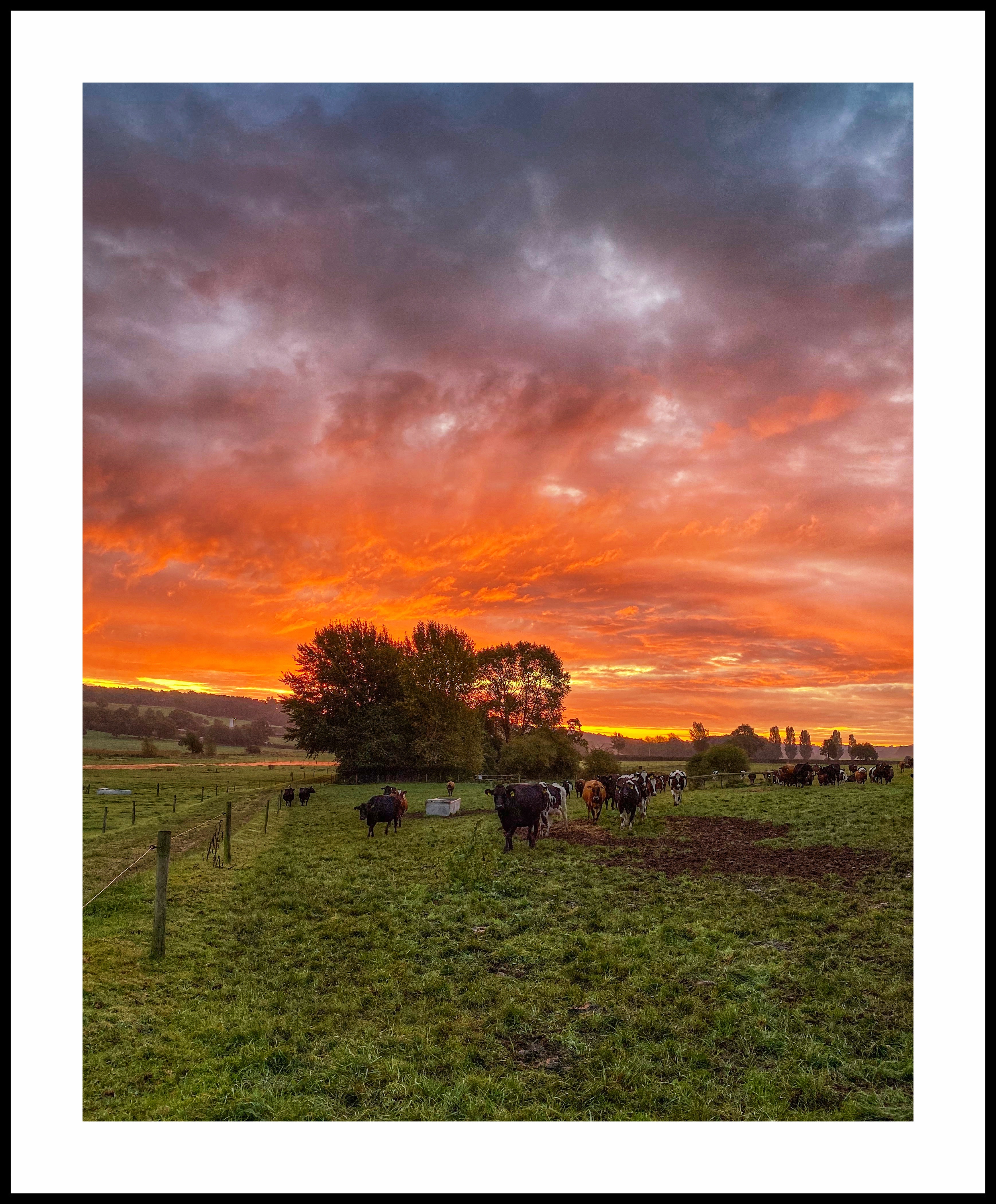 I wasn’t planning on a sunset photo today, and indeed it’s been mostly cloudy all day anyway. But then, just as our Christmas visitors were leaving, the setting sun lit up the underside of the broken clouds in spectacular fashion. Rather than walk to my usual spot up the road and risk missing the best of the light, I just took this photo of the cow silhouette through the garden fence. Moments later the colour had gone from the sky…