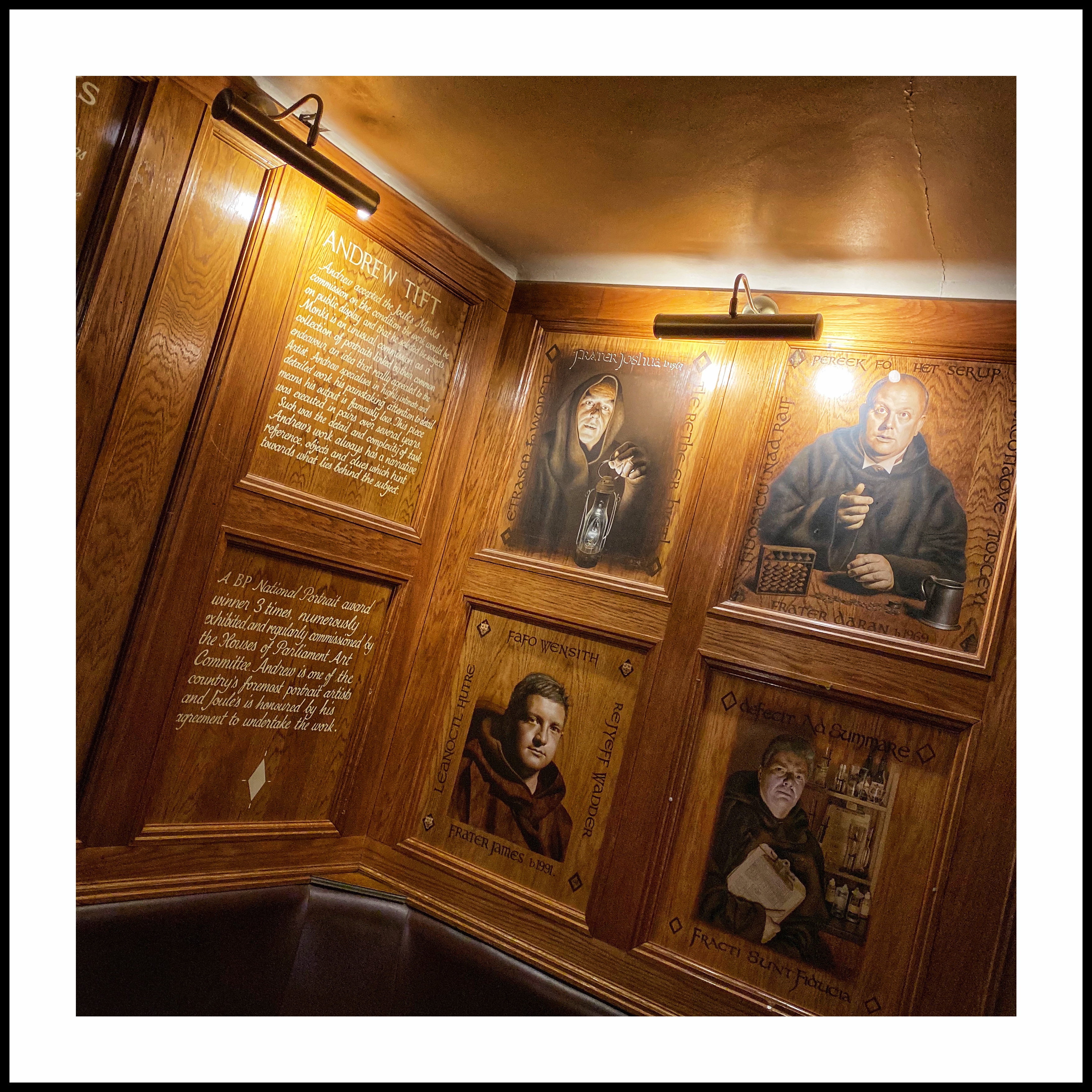 This is a detail in our local pub – The Red Lion. The owners commissioned an artist to paint portraits of eight of the craftsmen who had been involved in building the new brew house, but in the guise of ‘monks’. These amazing portraits were then reproduced on the oak panelling around the walls of the old bar area.