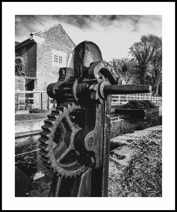 The gate paddle mechanism at #1 Lock at Tyrley Locks on the Shropshire Union Canal near Market Drayton. Completed in 1835, this canal was the last major project completed by Thomas Telford, the architect of much of the canal system in England. Looks to me like this gear mechanism is probably original…