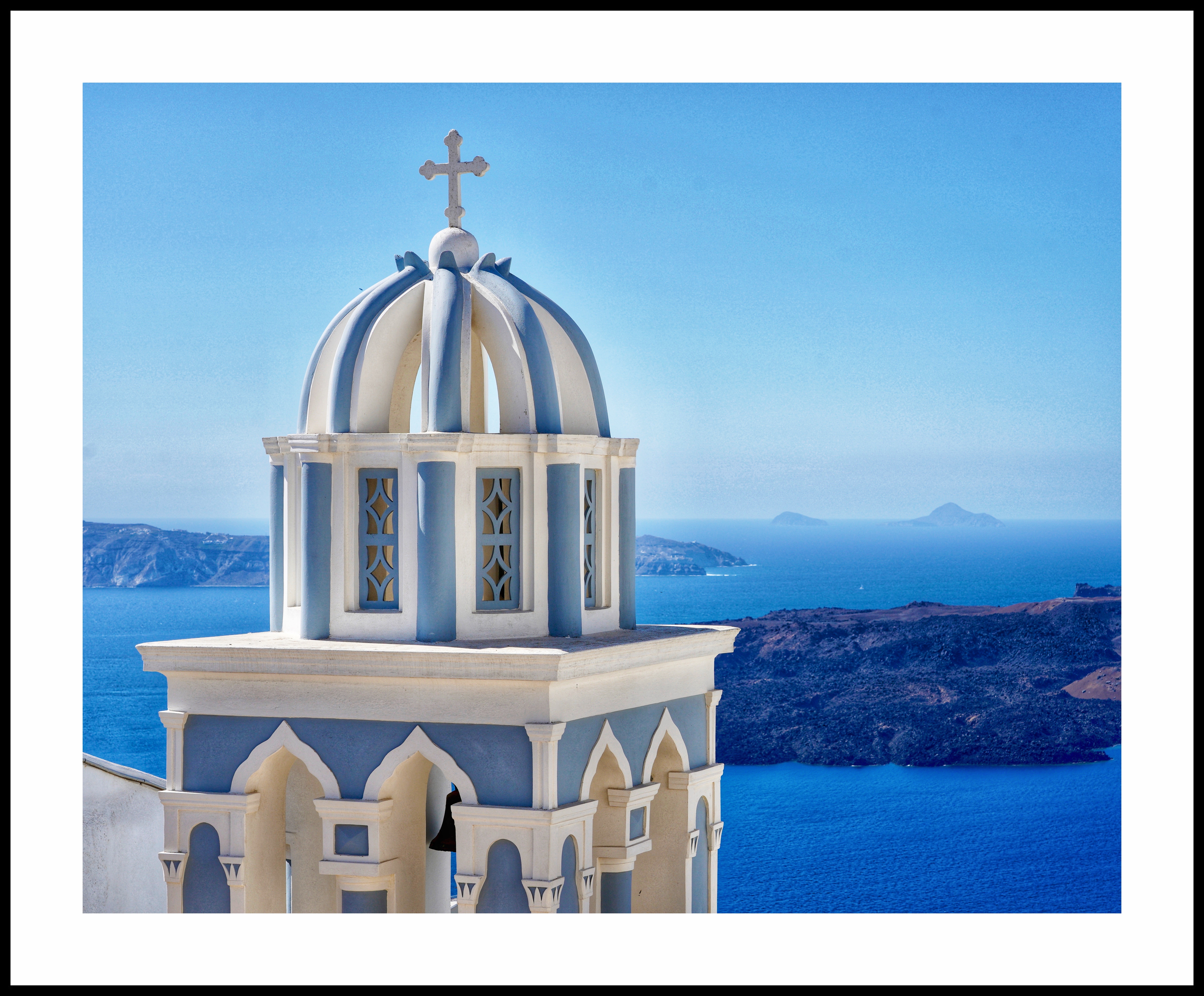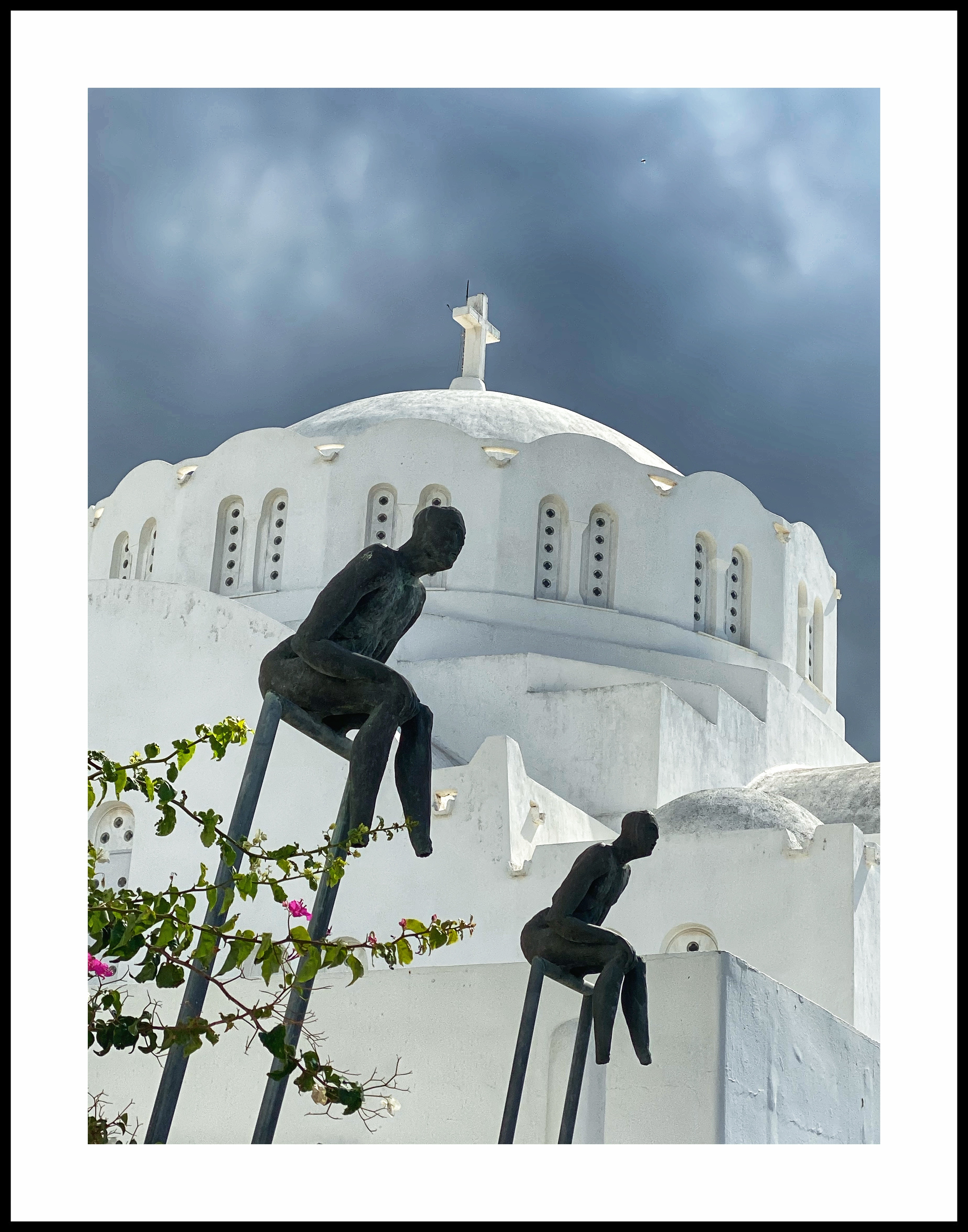 These two figures guard the entrance to the Greek Orthodox Church in Fira, Santorini. They sit very high in the air and appear to look down on people passing by. Positioning them in front of the huge church roof in the photo exaggerates their scale.