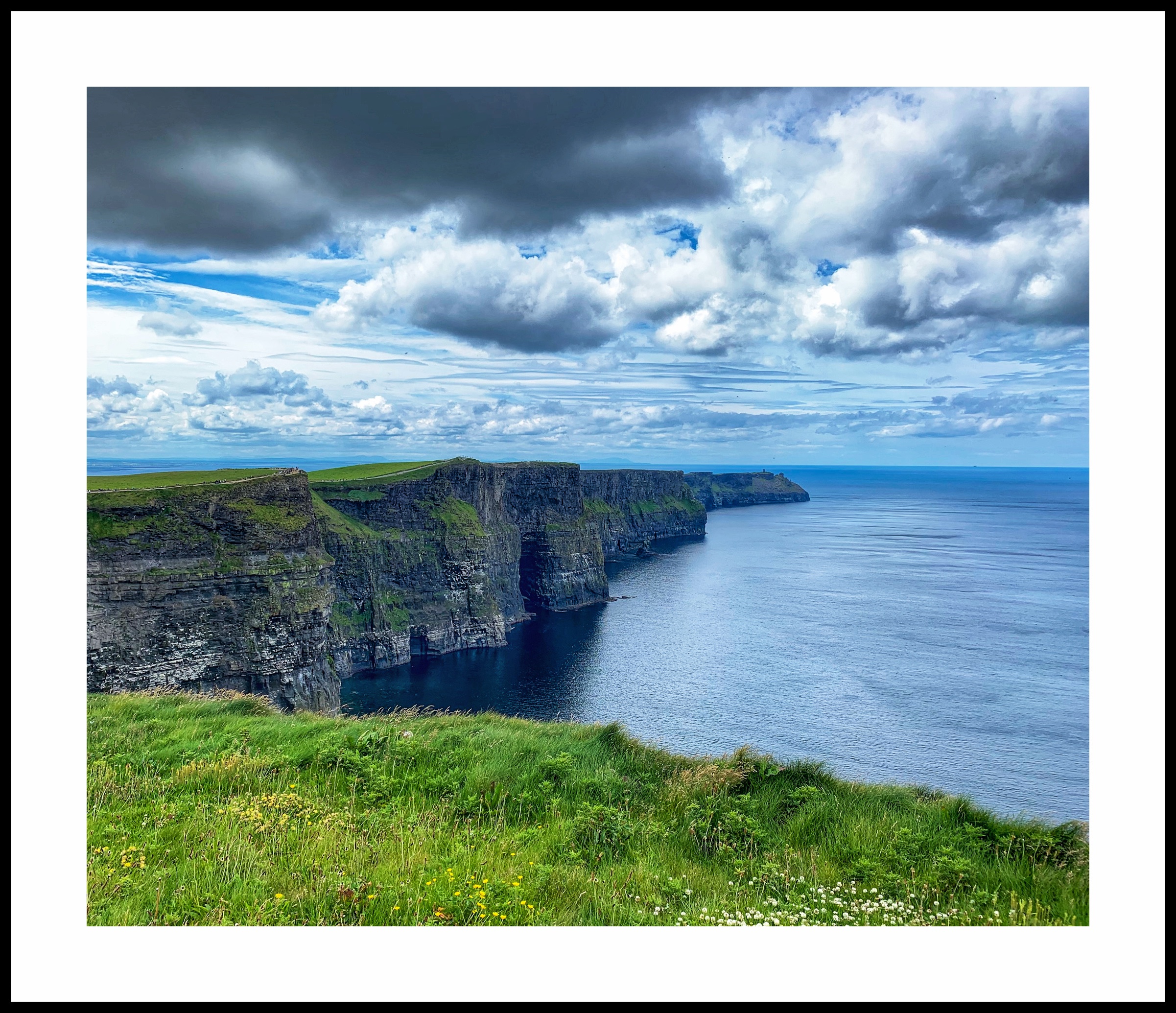 These are the Cliffs of Moher, and pretty impressive too…. It’s a great sight, but incredibly busy, with thousands visiting every day. The central area has marked paths, and the cliff edges are fenced off, but further round, it is much more open, and we saw people perilously close to the edge!
