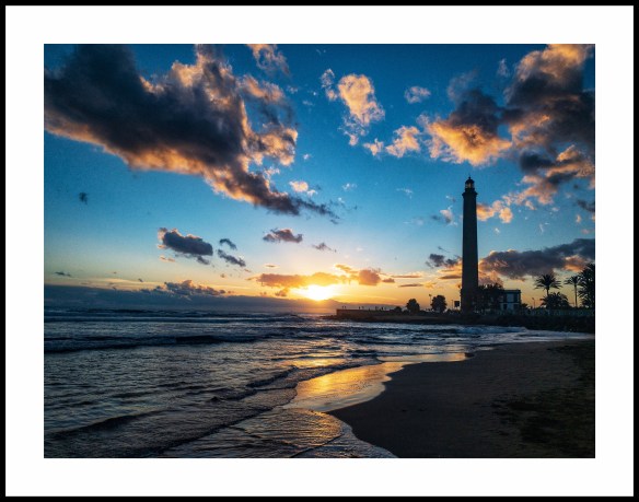 … to him who waits. So the sunsets every night of our holiday so far have been pretty rubbish – well, that is, with absolutely no cloud in the sky, the sun has just slipped away leaving just a faint glow – no drama at all. With some intermittent cloud today (our last day), it looked more promising so off I set to the lighthouse at Maspalomas to see what was in store… And boy, did it deliver! This is just an iPhone shot – hopefully I’ll have better still when I get to look at my Sony A7iii images on the computer. But for now, I’m happy…
