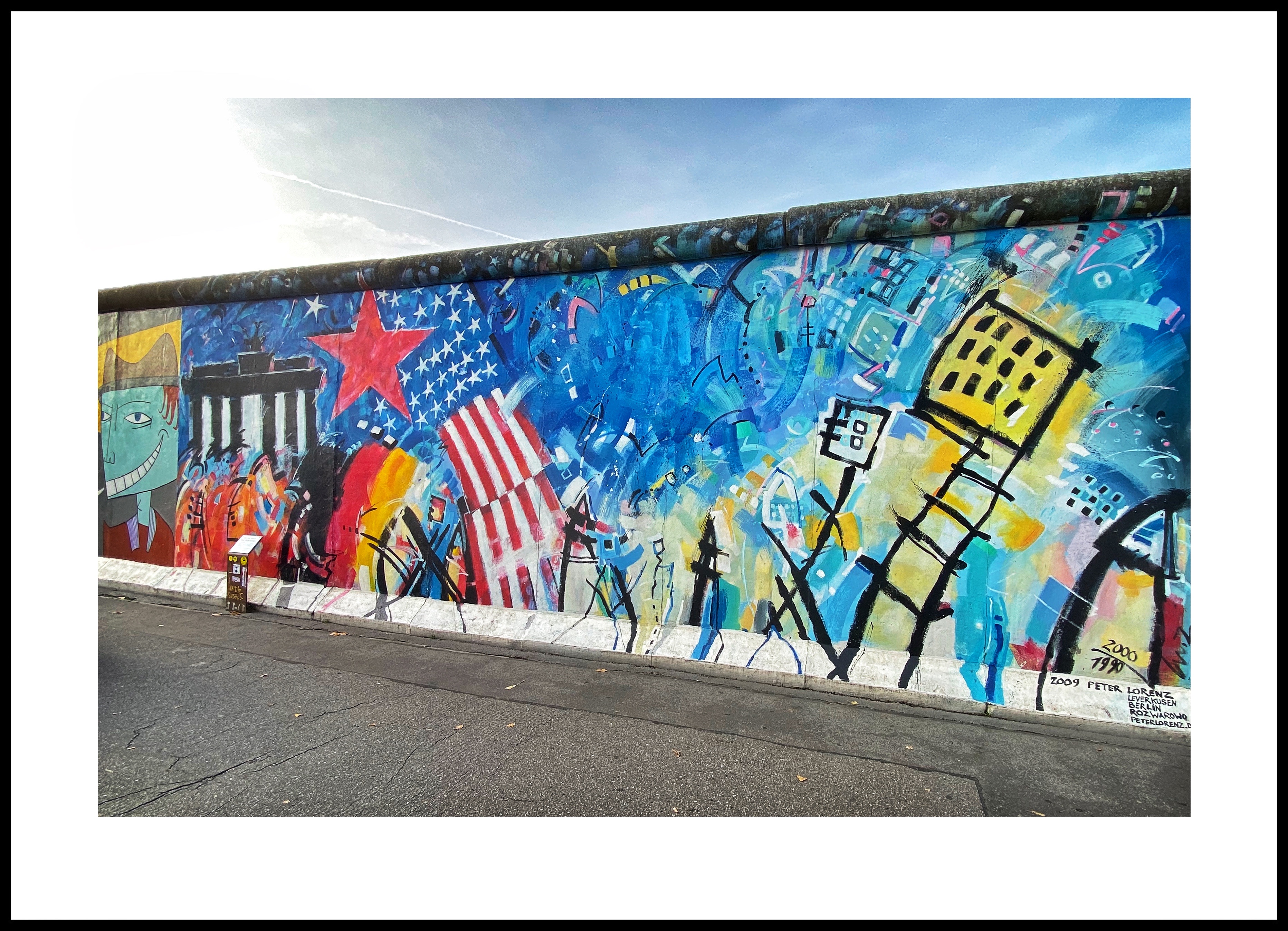 This is part of the East Side Gallery in Berlin, an outdoor art gallery using a 1.3km long section of the original Berlin Wall. The wall ‘fell’ in 1989, and a few short sections have been preserved to reflect their historical significance. Most of the paintings in the gallery depict themes of peace or reconciliation.