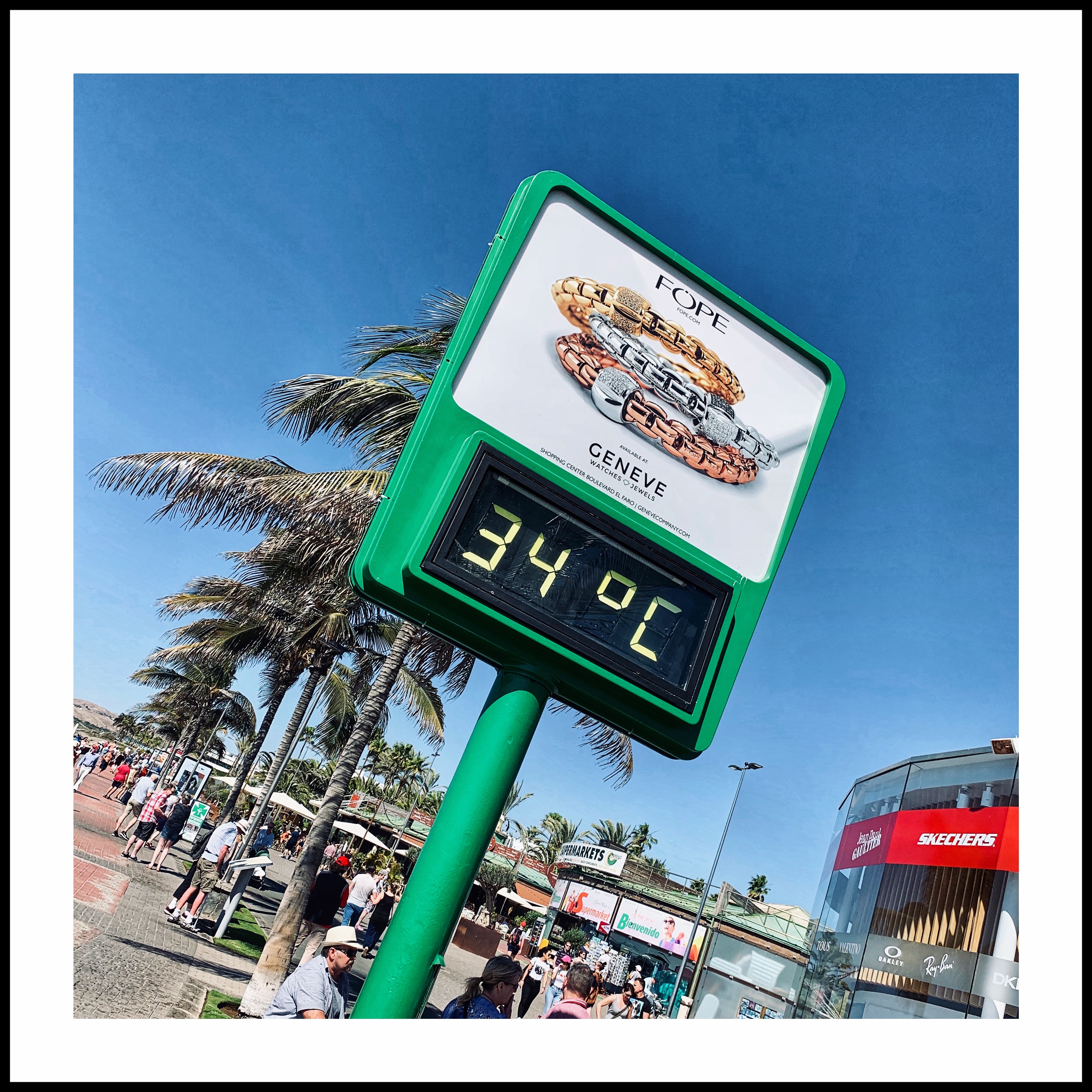 There’s no guarantee of warm weather and sunshine in the Canary Islands in February, but we hoped for temperatures in the low 20s, with at least some sunshine. Our expectations have been somewhat exceeded, with wall to wall sunshine all week, and as you see, the temperature peaked at an impressive 34°C this afternoon. So warm in fact that we had to seek shelter (in the bar of course!)